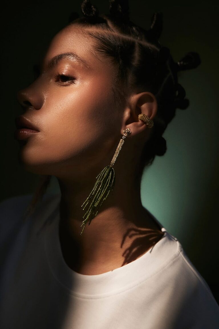 Pin earring in the shape of a Lola echeveria and a stem of echeveria twigs with dangling beads.